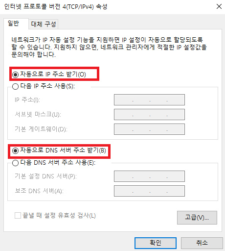 네트워크 설정에서 아래와 같은 설정으로 되어 있는지 확인하시면 됩니다.