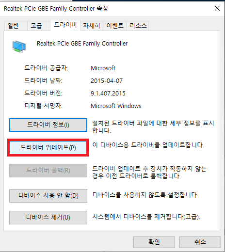 2번의 방법으로도 되지 않아서 이번에는 랜카드 쪽에 문제인지 확인하기 위해 장치 관리자로 들어가서 랜카드가 최신 버전인지 확인하는 부분입니다.
