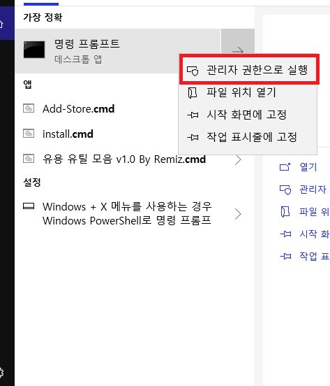 작업 표시줄에서 cmd를 검색해 우클릭 후 "관리자 권한으로 실행"을 선택해줍니다.