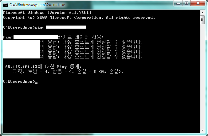 핑테스트 했을 때 불량이 뜨면 다음과 같은 도스창을 확인하실 수 있습니다.