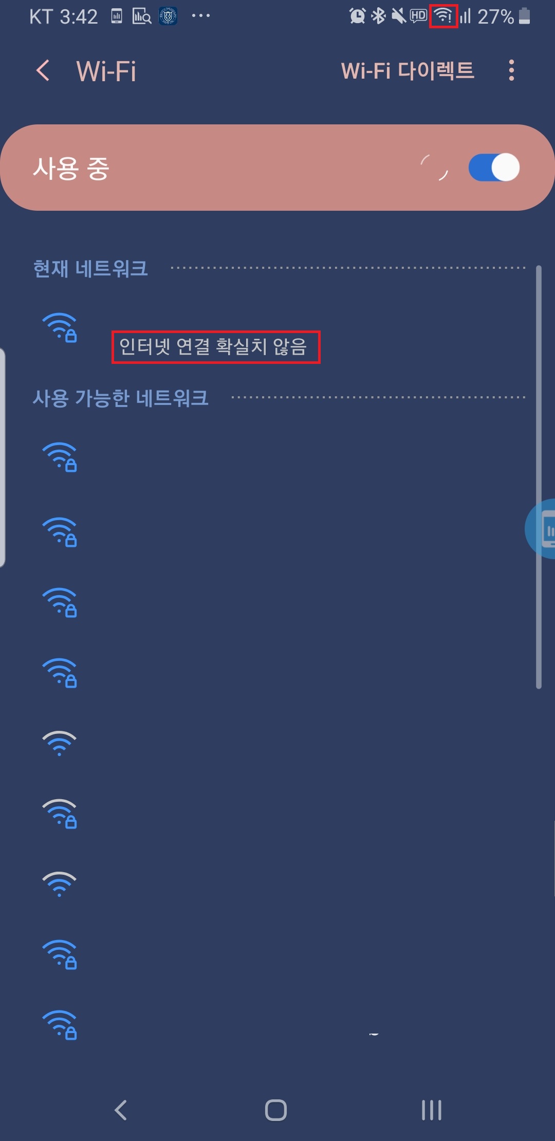 와이파이를 잡고나면 와이파이에 느낌표가 뜨면서 사용할 수 없다고 나옵니다.