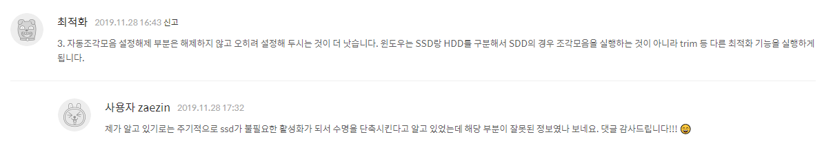 해당 조각모음 기능을 꺼야된다고 말씀드렸습니다. 저는 SSD에서 해당기능을 계속해서 활성화 시키게 되면 SSD가 불필요하게 작동되므로 수명단축이 되는 것으로 지금까지 생각해왔었습니다.