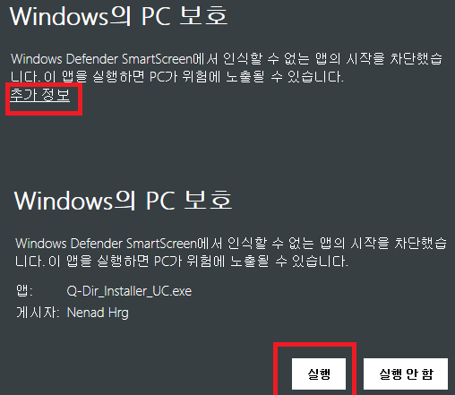 처음에 실행시키면 위와 같이 PC보호를 한다고 경고메세지가 뜨는데 추가 정보를 누르고 실행을 눌러 설치해주시면됩니다.