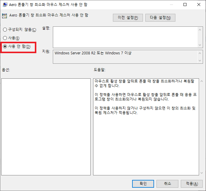 이렇게 설정하면 더이상 창을 움직여도 모든 창들이 최소화 되지 않습니다.