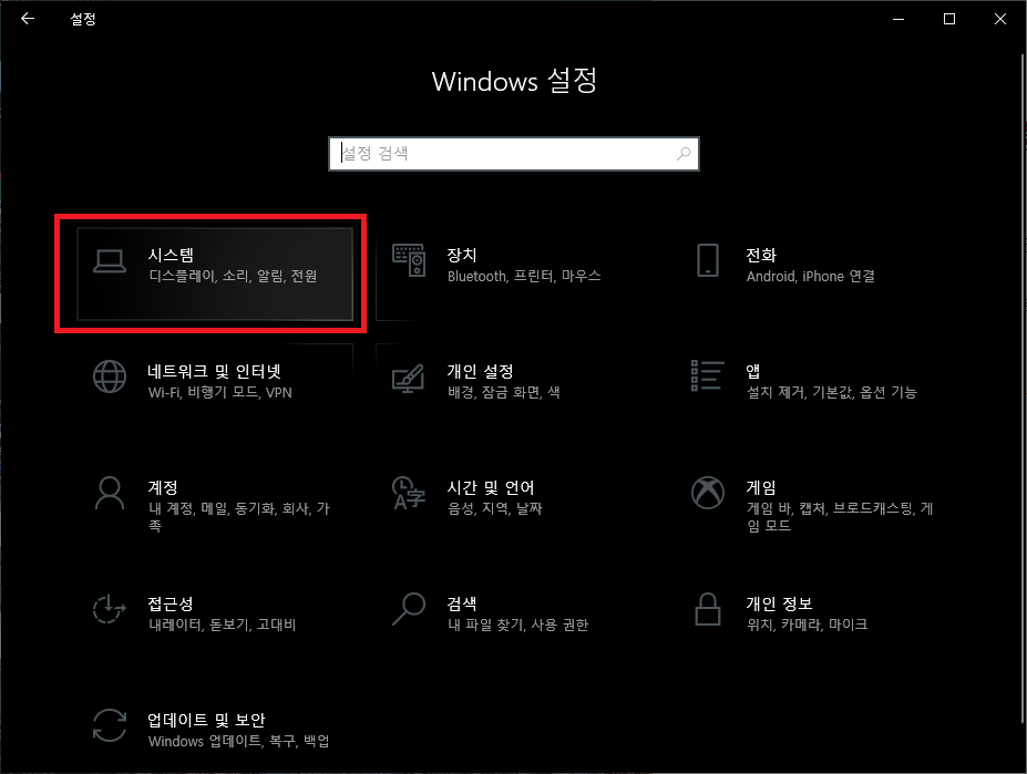 1. 시작 - 설정(톱니바퀴) - 시스템을 누릅니다.