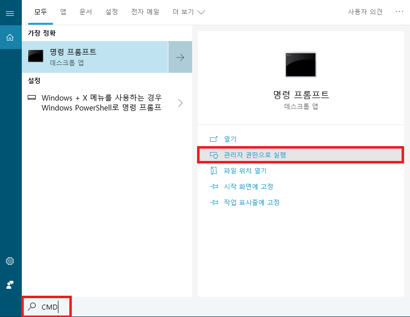 (1) 시작 - 명령 프롬프트 - CMD 검색 후 관리자 권한으로 실행