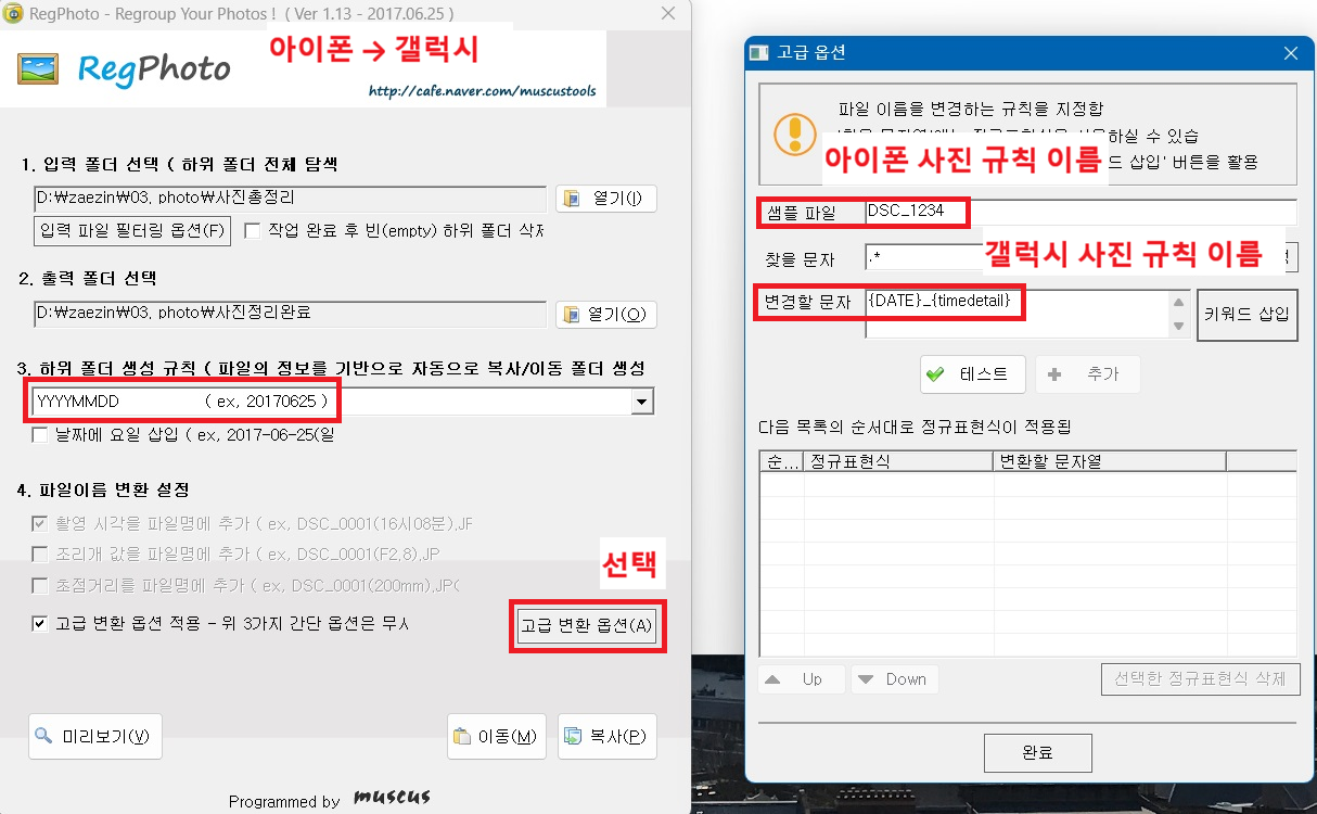 위와 같이 3번 하위 폴더 생성 규칙에서 'YYYYMMDD'를 클릭하고 고급 변환 옵션을 들어간다.