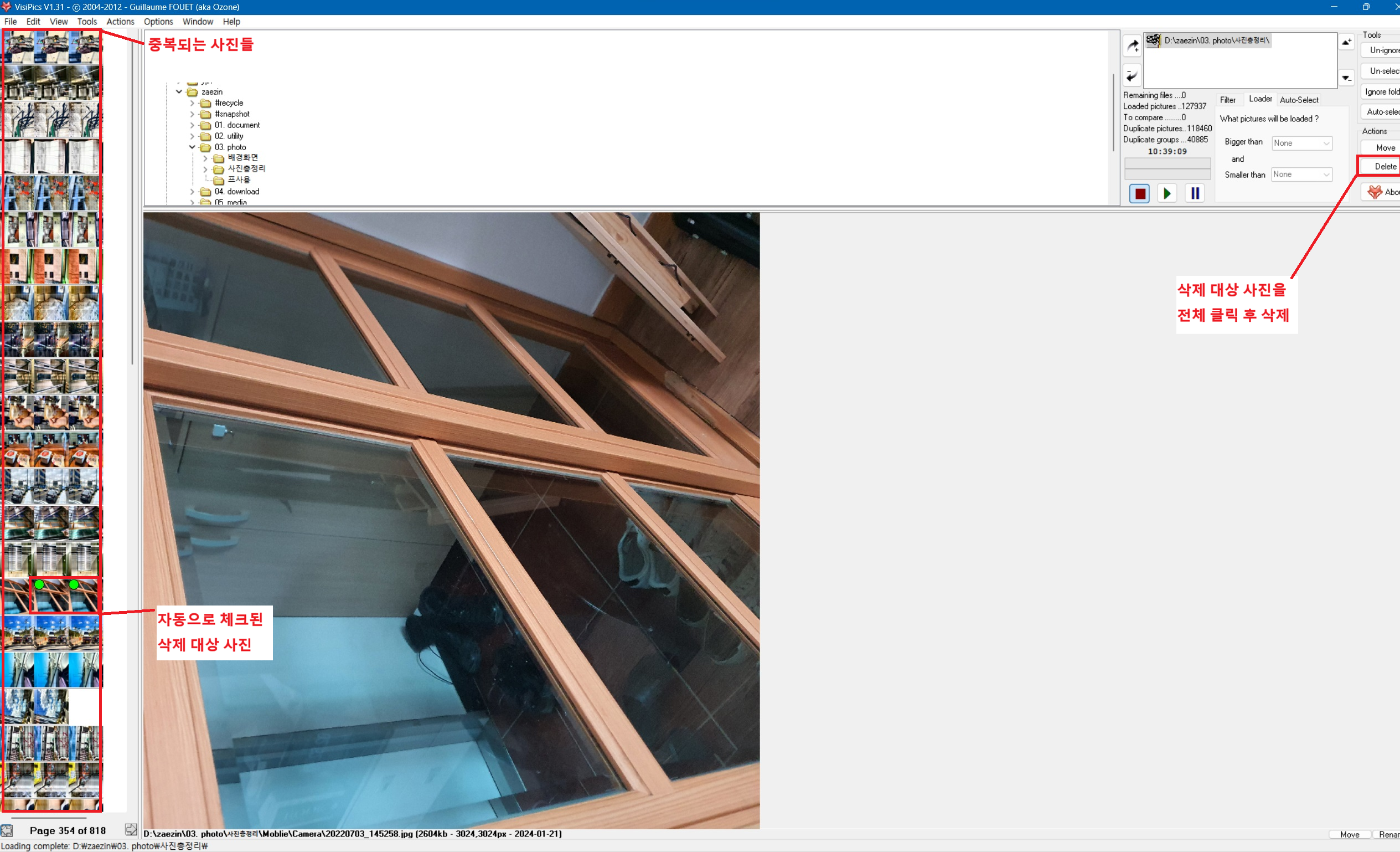 여기서 보면 초록색 불이 들어오는 건 자동으로 삭제 대상이 되는 사진들을 표시한 것이다.