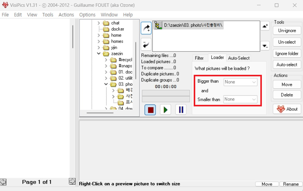 기본옵션에는 몇 KB이상, 몇 MB이하 기준이 있는데, 보통 사용하시는 분들은 전체 사진들을 중복확인 할 것이기 때문에 None으로 꼭 설정하고 사용할 것